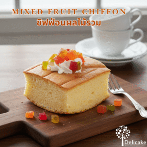 "ขอต้อนรับเข้าสู่โลกของความสดชื่นและสีสันที่ลงตัว! ✨ 'ชิฟฟ่อนผลไม้รวม' ชิ้นนี้คือการผสมผสานที่สมบูรณ์แบบระหว่างความนุ่มละมุนของเนื้อเค้กและความเปรี้ยวหวานสดชื่นของผลไม้ตามฤดูกาล! 🥝🍓🥭